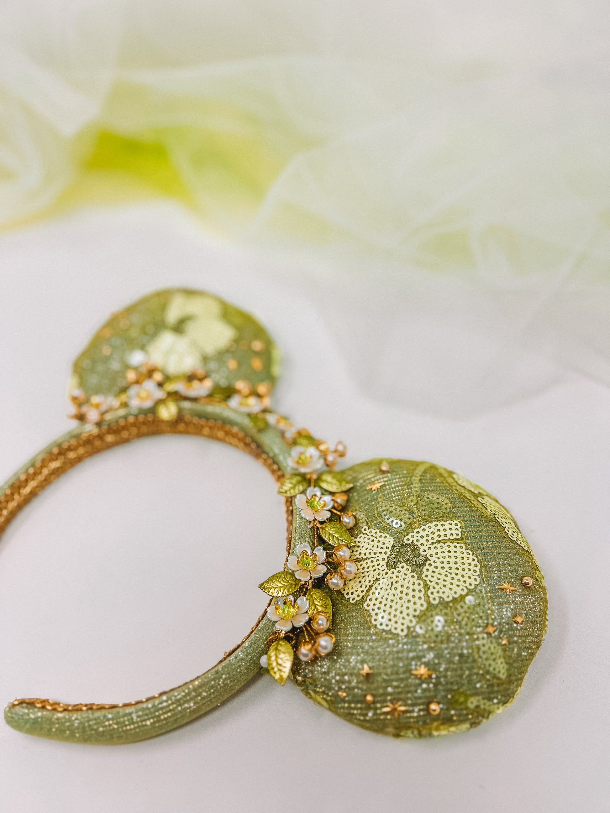 journey to the fairy hollow with these pixie inspired ears 🧚♀️ made with embroidered fabric, hand-laid embellishments, double layer deluxe fabric and finished with a leaf crown. These are perfect for any flower fest!