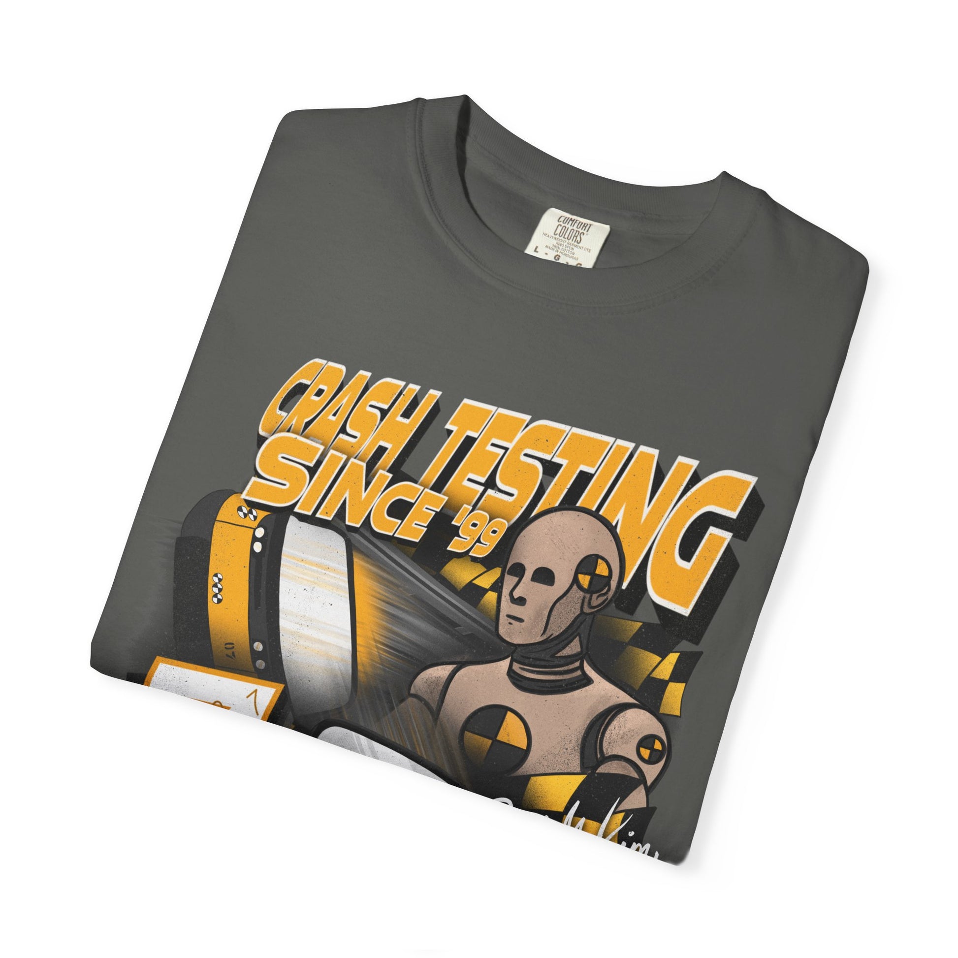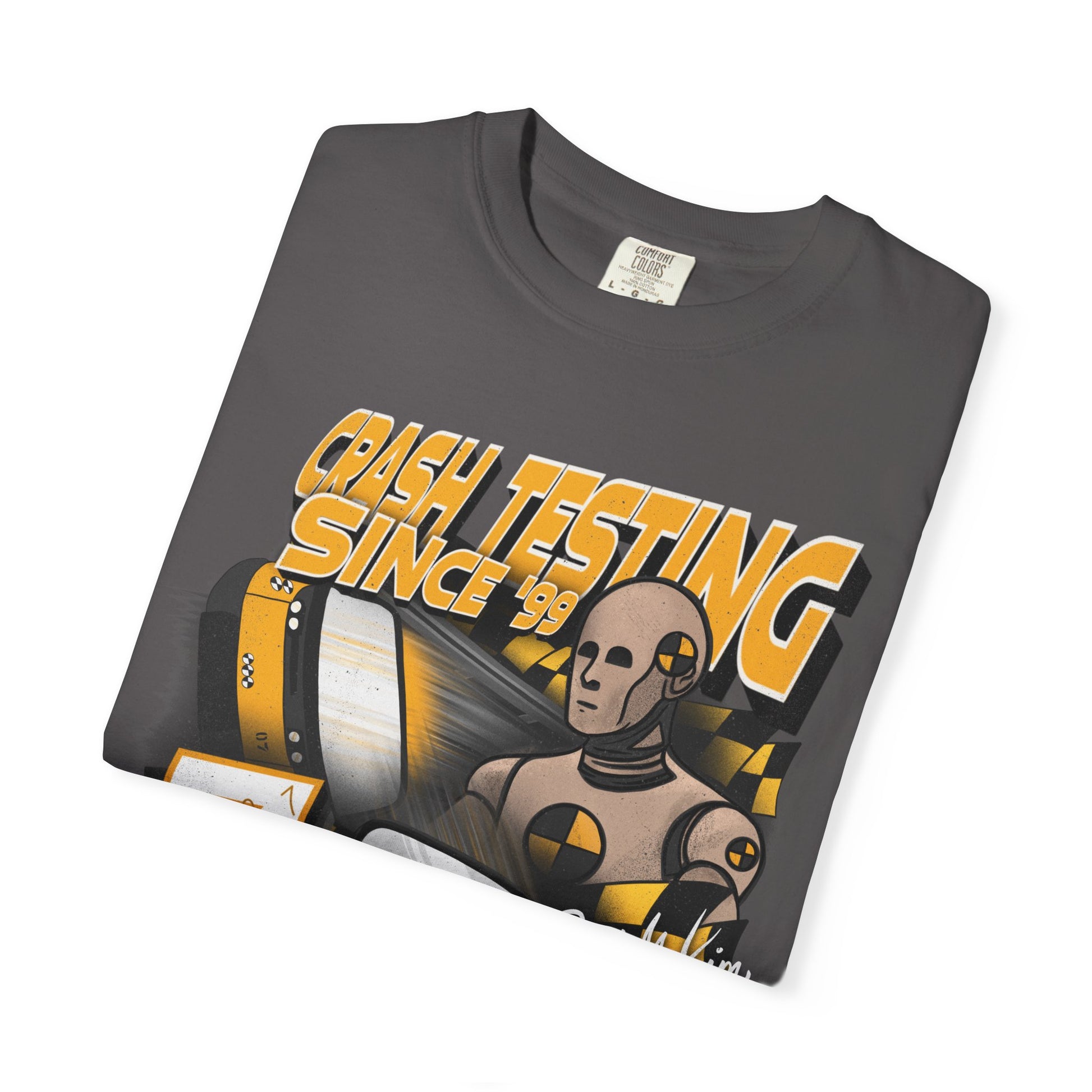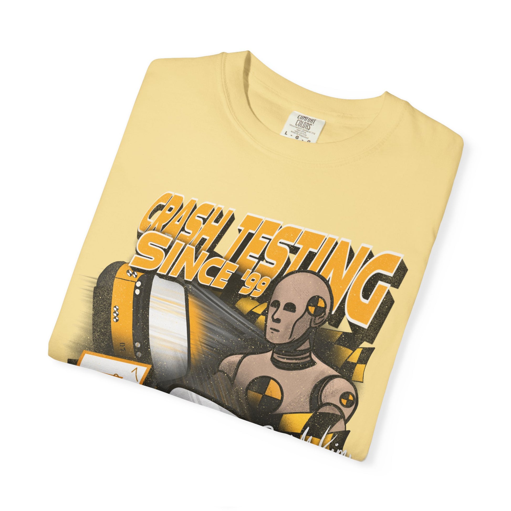 Take on the barrier test with your favorite crash test dummy! This tee is perfect for anyone looking to add a little nostalgia to their park day. DTG printed on comfort colors tee by our production partner. Ships out in 1-3 days.