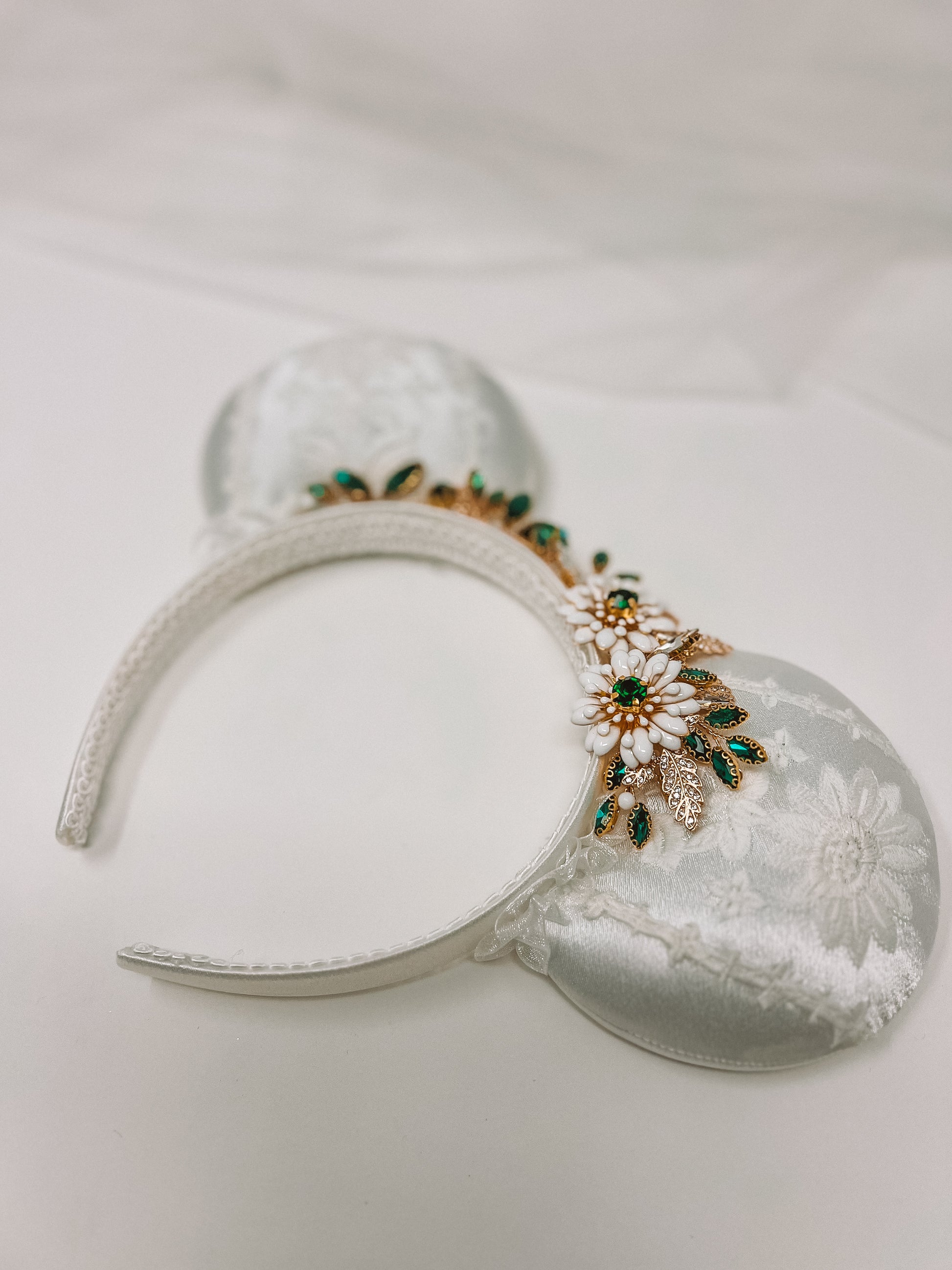 VEILS ARE NOT INCLUDED. These are a part of our Princess Bridal Luxury Collection. Made with embroidered gold fabric, handlaid golden flower vine, gemstones and other embellishments, these ears are made inspired by your favorite princesses. Lace and embellishment placement WILL vary from piece to piece.
