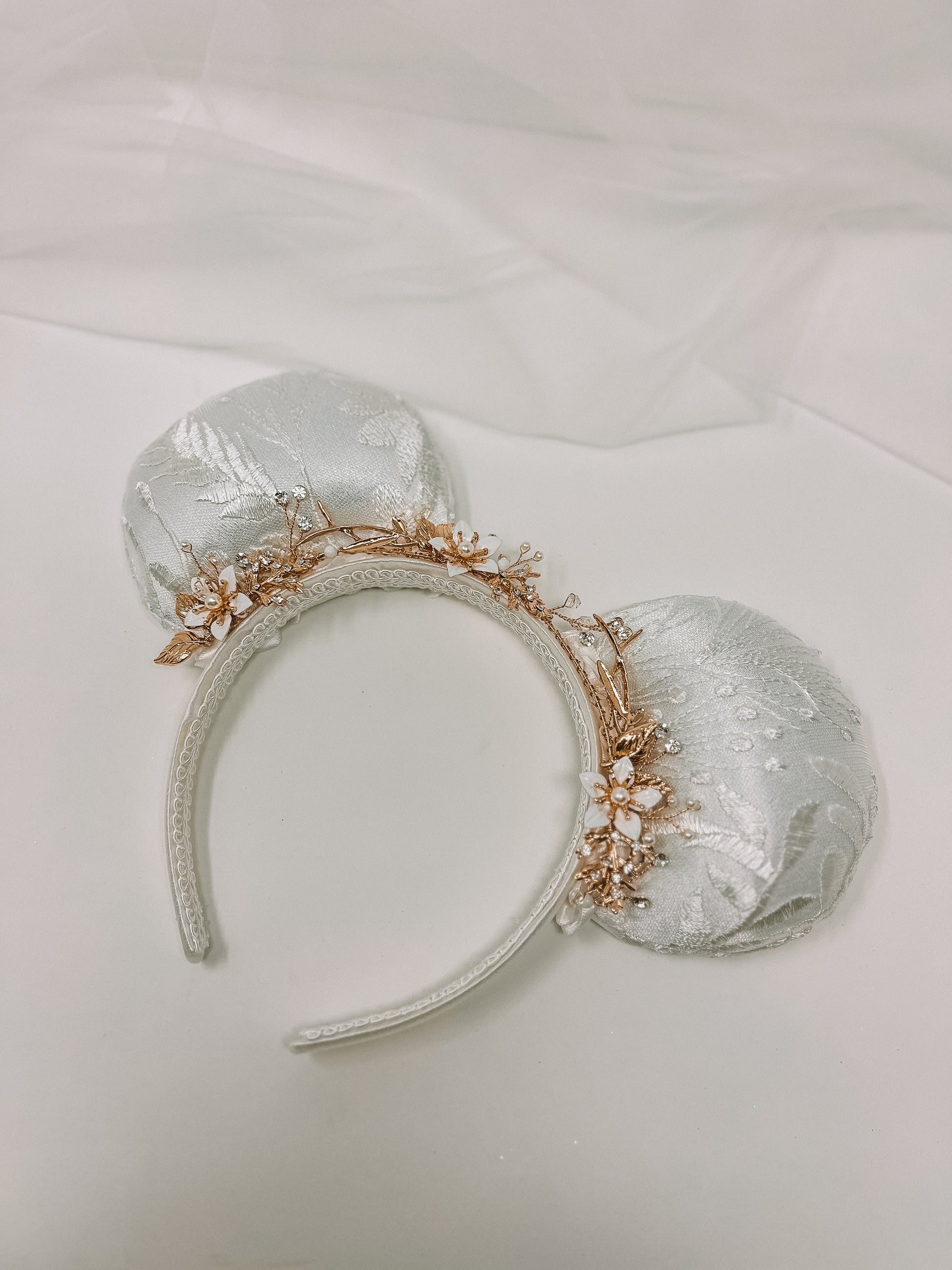 VEILS ARE NOT INCLUDED. These are a part of our Princess Bridal Luxury Collection. Made with embroidered gold fabric, handlaid golden flower vine, gemstones and other embellishments, these ears are made inspired by your favorite princesses. Lace and embellishment placement WILL vary from piece to piece.